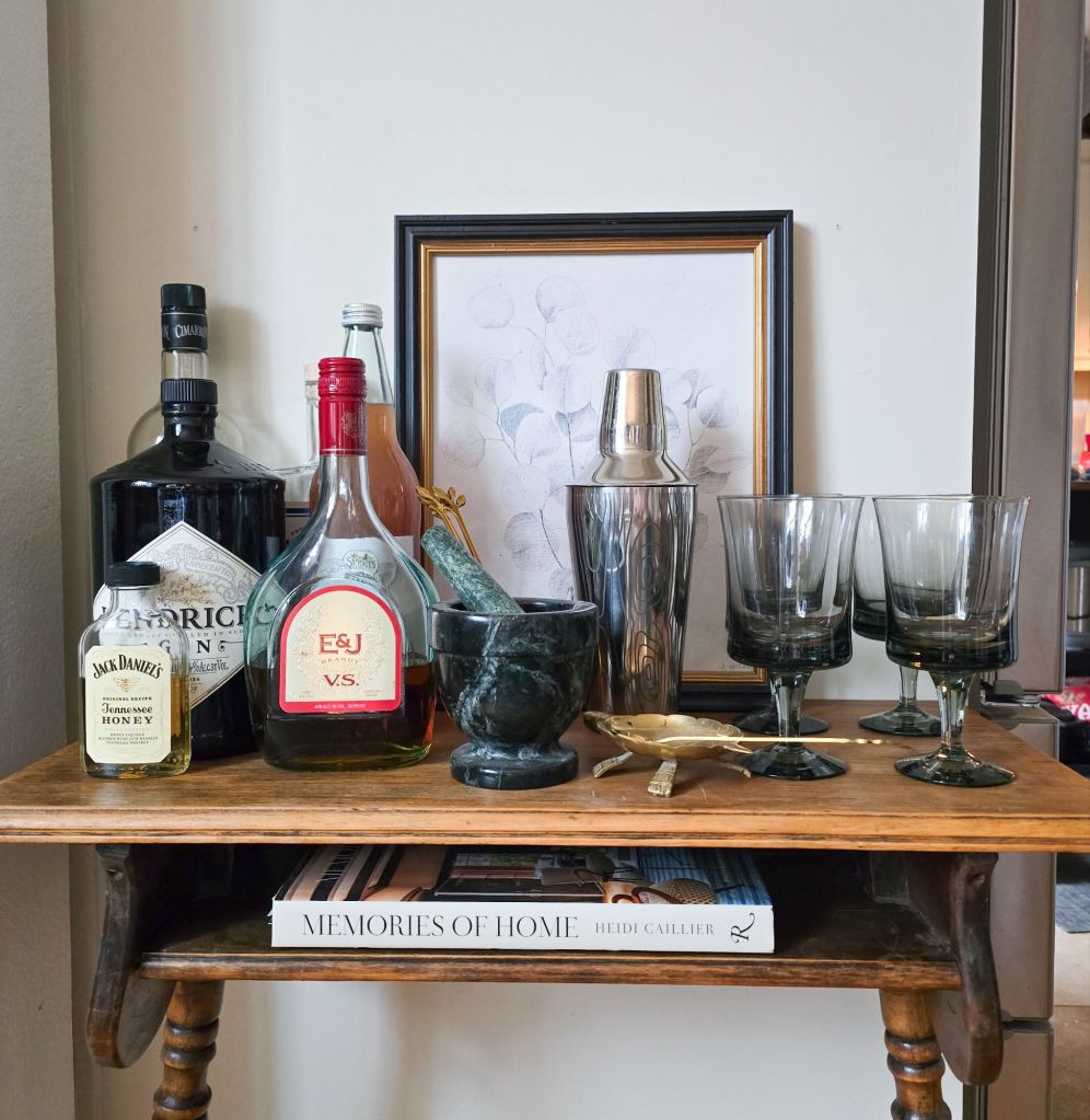 I used this vintage school desk as a bar cart and kept it simple yet functional.